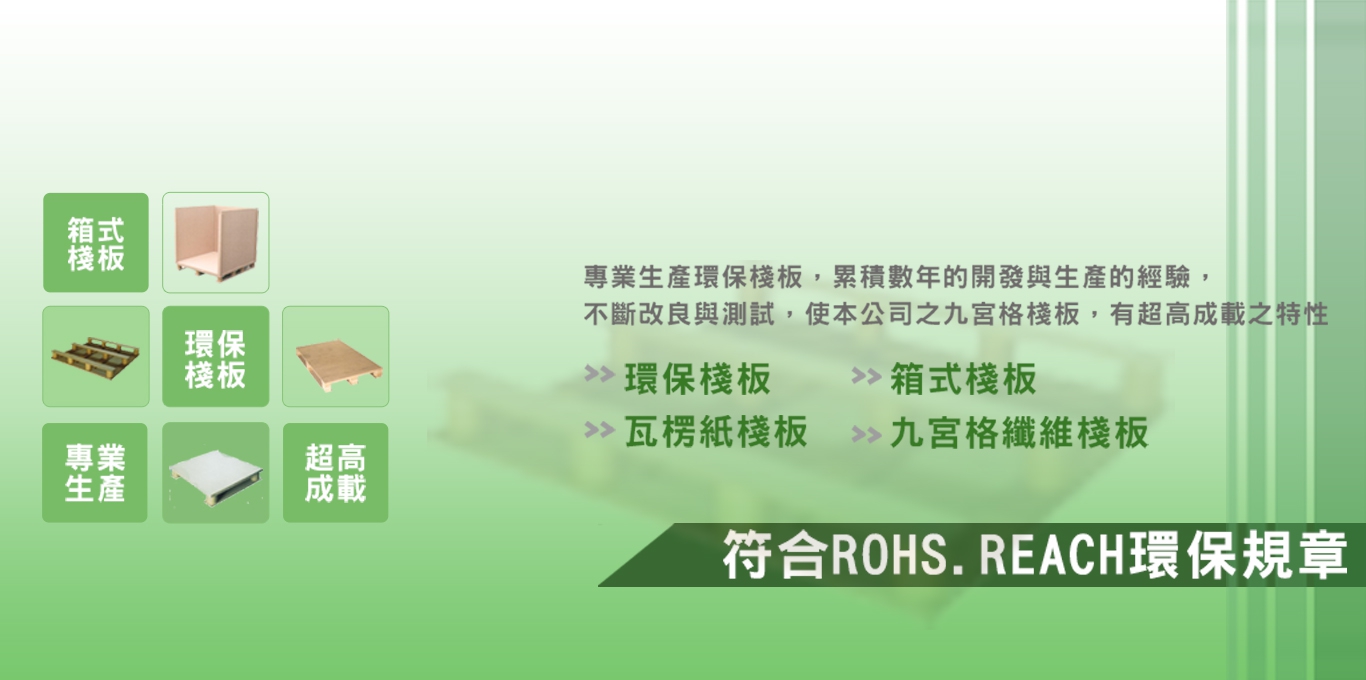 專業生產環保棧板,符合RoHS,REACH等環保規章要求,免煙燻處理,屬紙棧板類,並獲得多數客戶的信賴與使用,累積數年的開發與生產的經驗,不斷改良與測試,除原有產品外,更持續精進設計,使本公司之環保棧板,有超高成載之特性,期能滿足客戶之嚴格需。